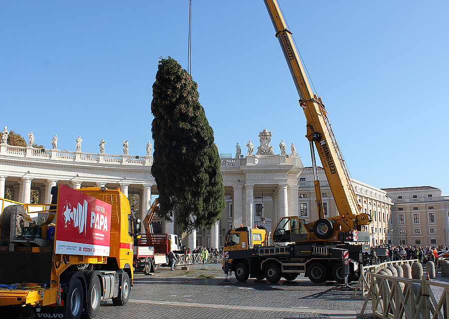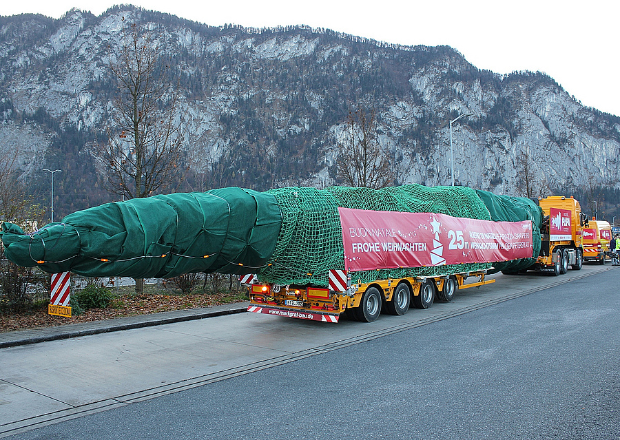Die Vorbereitungen liefen über Monate: Unsere Logistik koordinierte alle Details – von den Genehmigungen über die Routenplanung bis hin zur Absicherung des Transports. Schließlich sollte alles perfekt sein, wenn der MARKGRAF Schwertransport auf dem Peterplatz ankommt. Unser Fahrer Thomas machte sich schließlich auf den Weg: Vier Tage war er unterwegs, legte rund 1.200 Kilometer zurück und meisterte zahlreiche Herausforderungen wie Tag- und Nachtfahrverbote. Vor Ort übernahmen die italienischen Kollegen das Aufstellen des Baumes mit einem Autokran. Für den festlichen Baumschmuck sorgten Kinder, die Kugeln aus Ton bemalten. Nach Weihnachten wurden diese Kugeln für den guten Zweck versteigert – ein schöner Gedanke, der das Projekt noch besonderer machte.