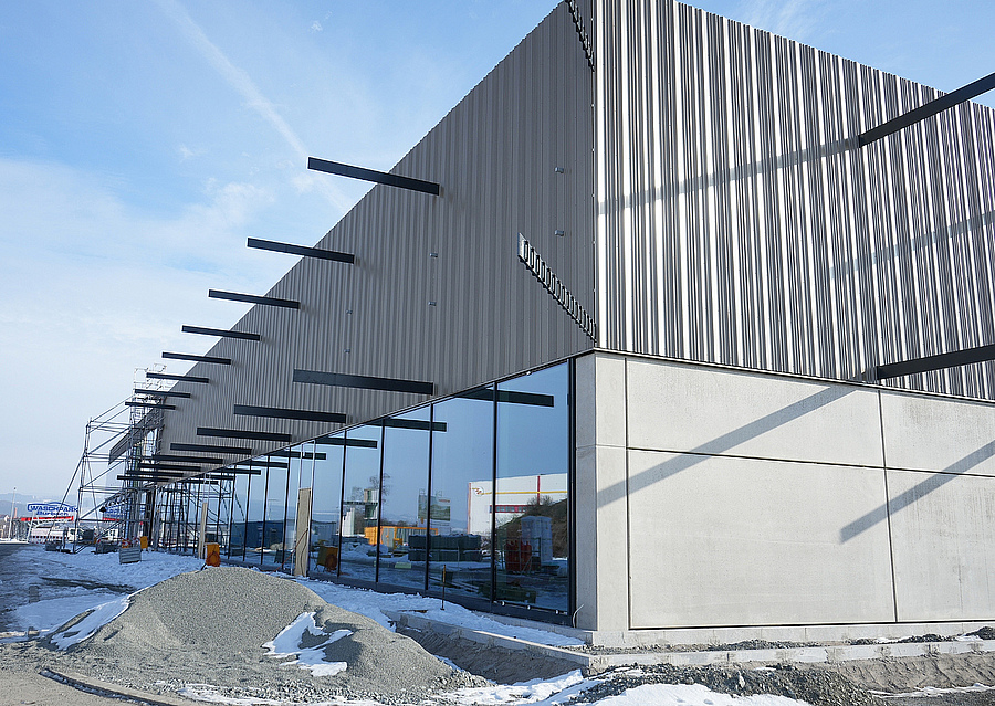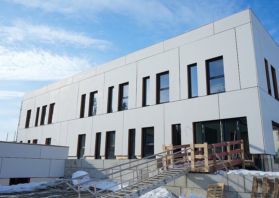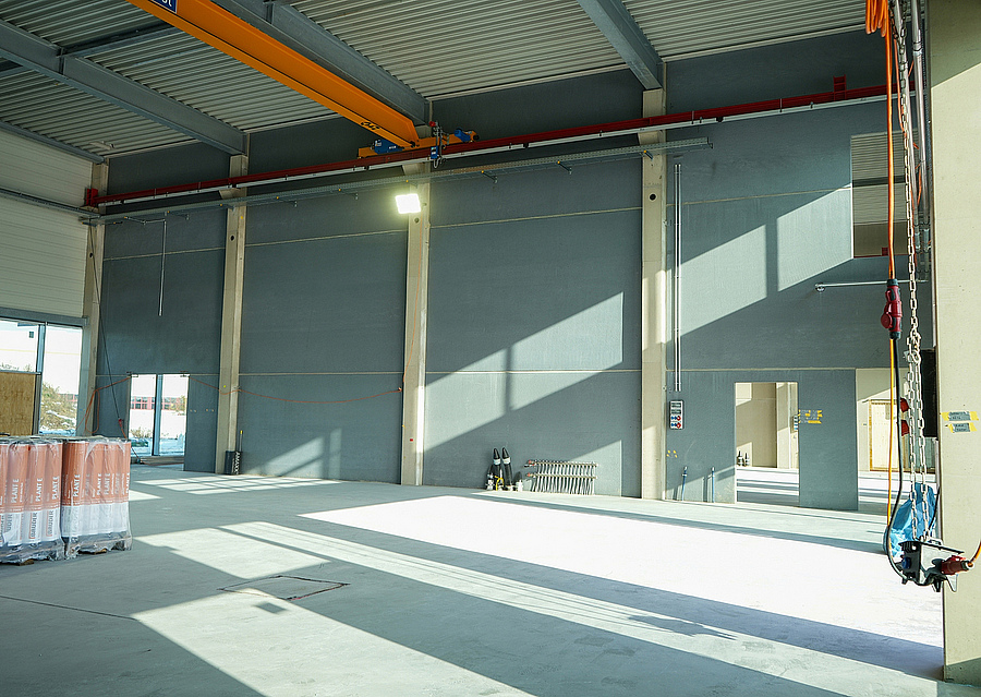 Im neuen Trainings- und Ausbildungszentrum bestehen die Zwischenwände im Hallentrakt aus Biokohlenstoffbeton. Für das Bürogebäude in Immenreuth kam ausschließlich Carbonbeton zum Einsatz – kombiniert mit Glasfaserbewehrung und Holz-Hybrid-Decken.