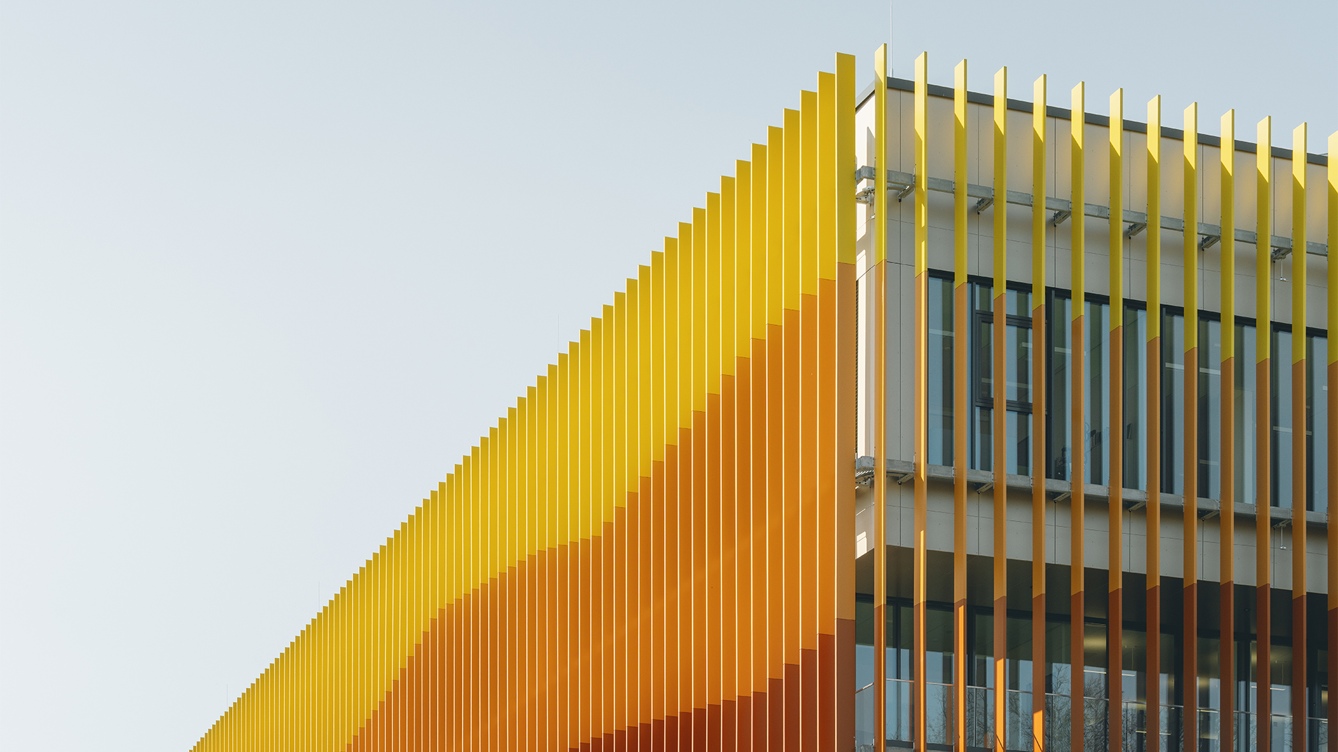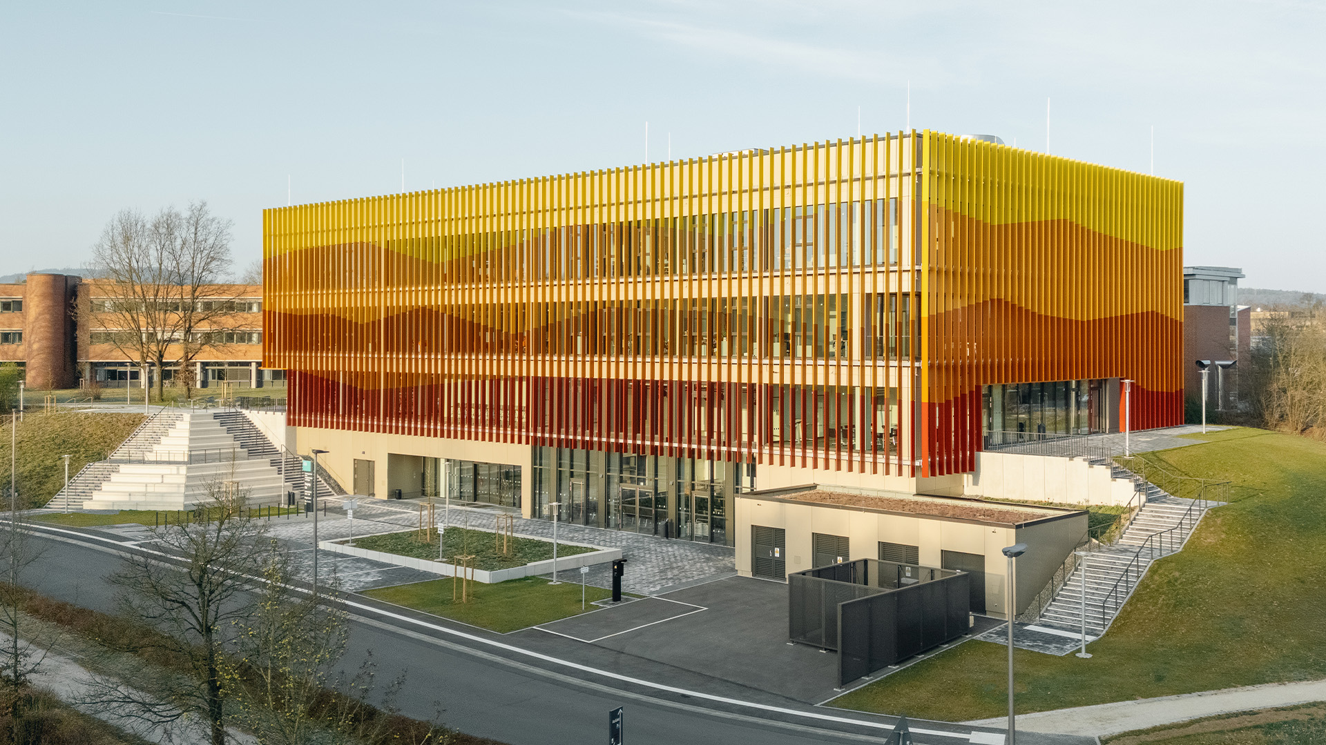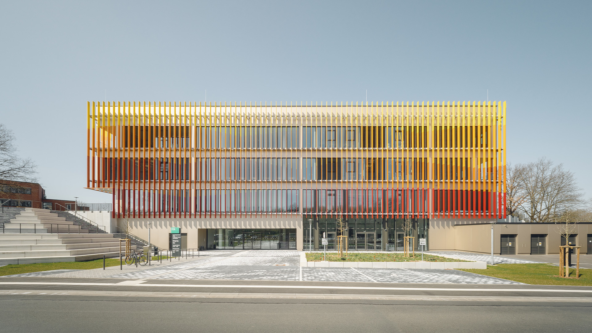 Ein architektonisches Highlight ist die anspruchsvolle Fassadengestaltung: Die vorgehängte, hinterlüftete Konstruktion mit vertikalen Lamellen greift gestalterische Elemente der afrikanischen Savannenlandschaft auf und verleiht dem Gebäude eine besondere Identität.