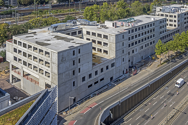 Die unterschiedlichen Nutzungen – stützenfreie Einzelhandelsfläche im Erdgeschoss, Parken im Untergeschoss sowie Hotel- und Büroaufbauten in den Obergeschossen – erforderten variierende Achsraster und unterschiedliche lichte Raumhöhen. Um diesen Anforderungen gerecht zu werden, wurde das statische System so konzipiert, dass weit gespannte TT-Decken in Kombination mit lastabtragenden Stahlbeton-Unterzügen einen möglichst stützenfreien Raum ermöglichen. Die Bauausführung erfolgte überwiegend in Fertigteilbauweise.