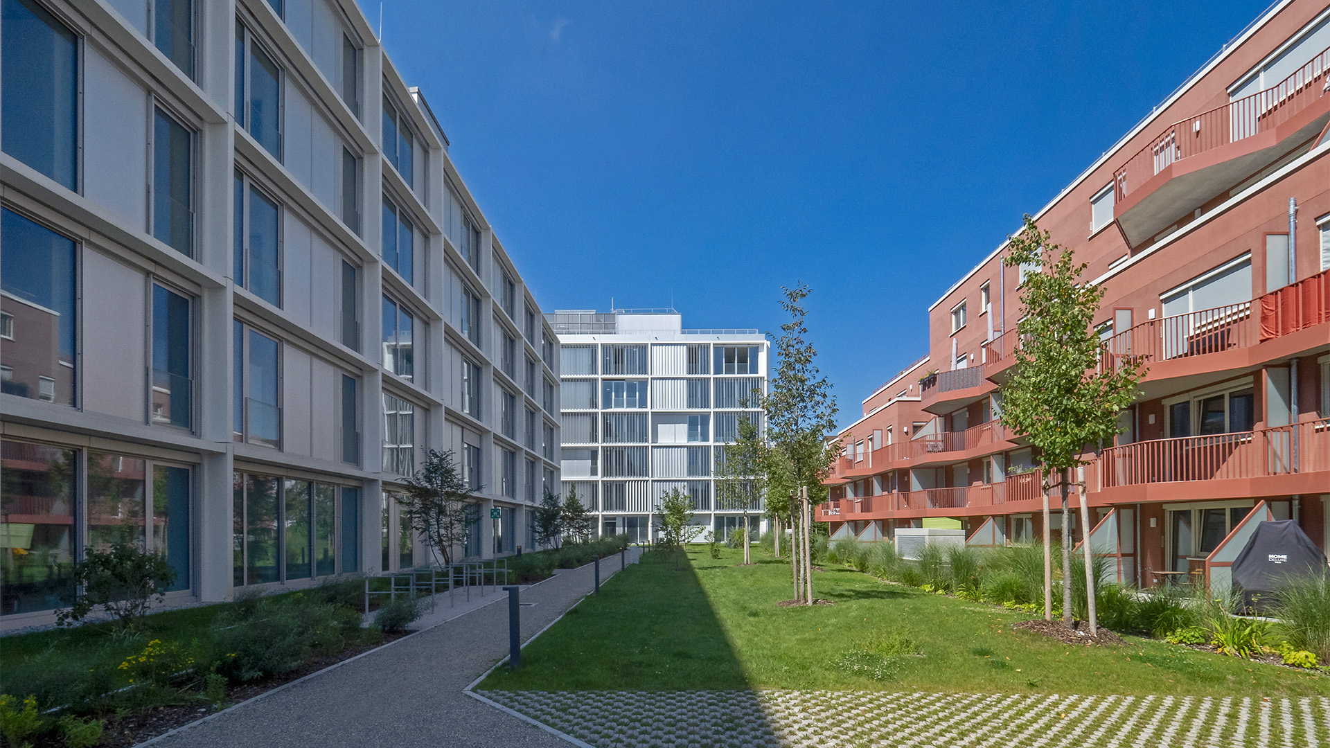 Das gesamte Areal überzeugt durch eine nachhaltige Planung: weitläufige Grünflächen, ein breites Mobilitätsangebot mit Tiefgaragenstellplätzen und E-Ladestationen sowie Zertifizierungen nach DGNB- und LEED-Standard sorgen für ökologische Zukunftsfähigkeit.